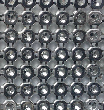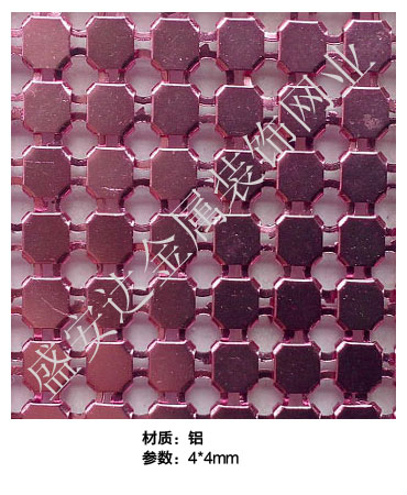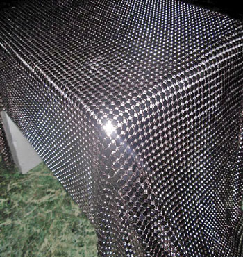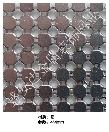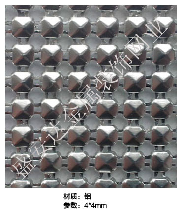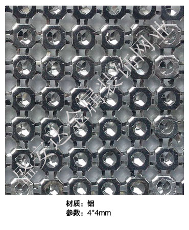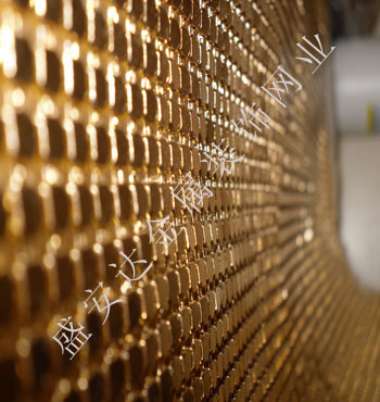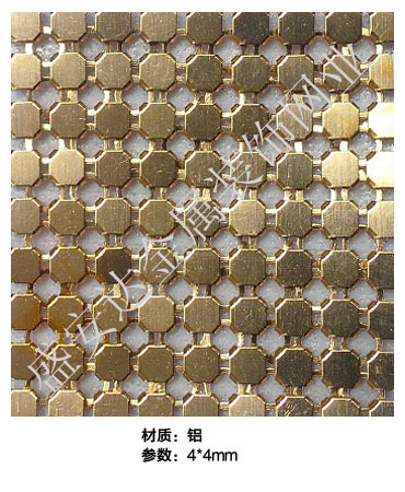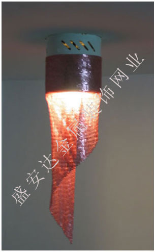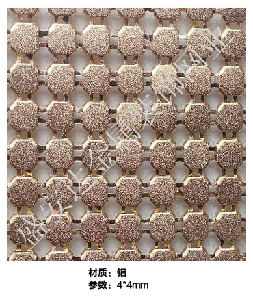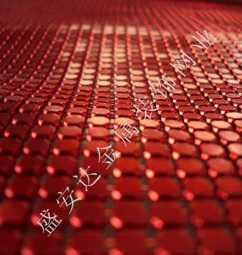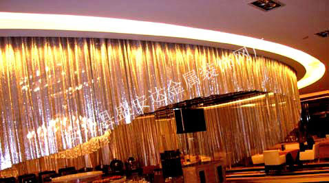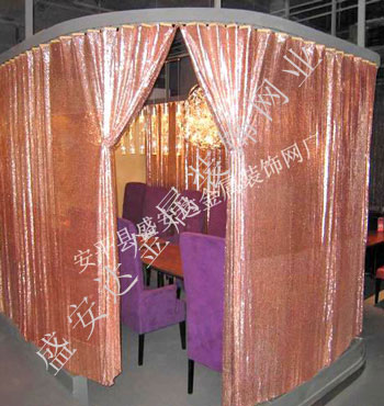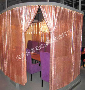 金屬布簾----是多個鋁網片結合而成,網片主要樣式有平面,圓珠,梅花和鉆石等形狀,廣泛用于酒店,咖啡廳,音樂廳,賓館等屏風割斷吊頂等,也可用于櫥窗裝飾,它有著極強的裝飾效果,金屬質感的鱗片可以像布一樣可以隨意變動,在光影變幻之下,顯示出迷人的斑斕色彩,是最新的流行時尚元素之一。